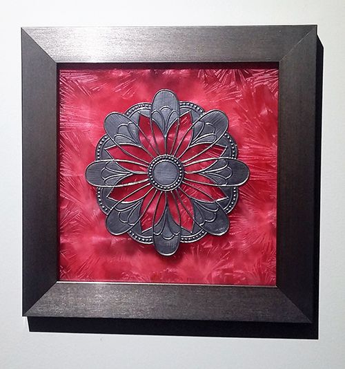 Mandala repujado en estaño sobre vidrio pintado en marco de madera.