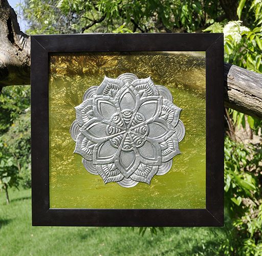 Mandala repujado en estaño sobre vidrio pintado en marco de madera